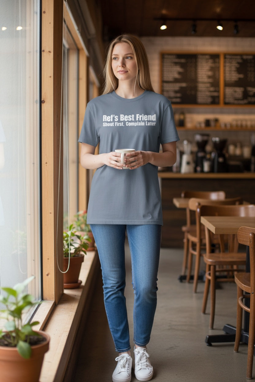 For football fans who love tactics and match-day banter, this funny soccer tee says it all. Featuring the slogan “Ref’s Best Friend – Shout First, Complain Later,” it’s perfect for supporters, coaches, and anyone who enjoys the chaos of the touchline.